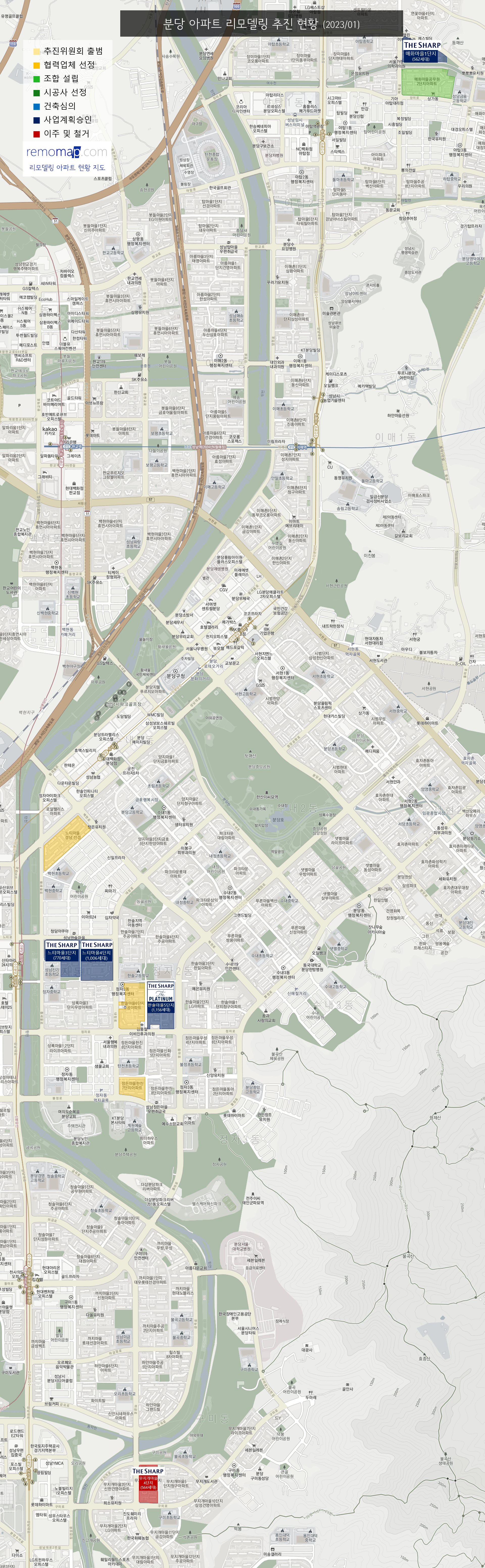 분당 아파트의 각 사업 단계별 진행 현황을 색으로 구분하여 표시하였습니다.